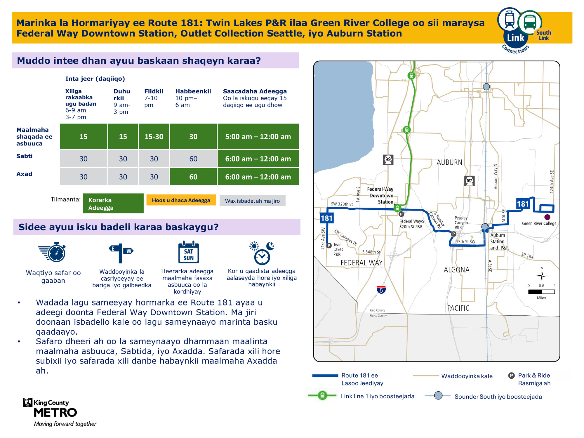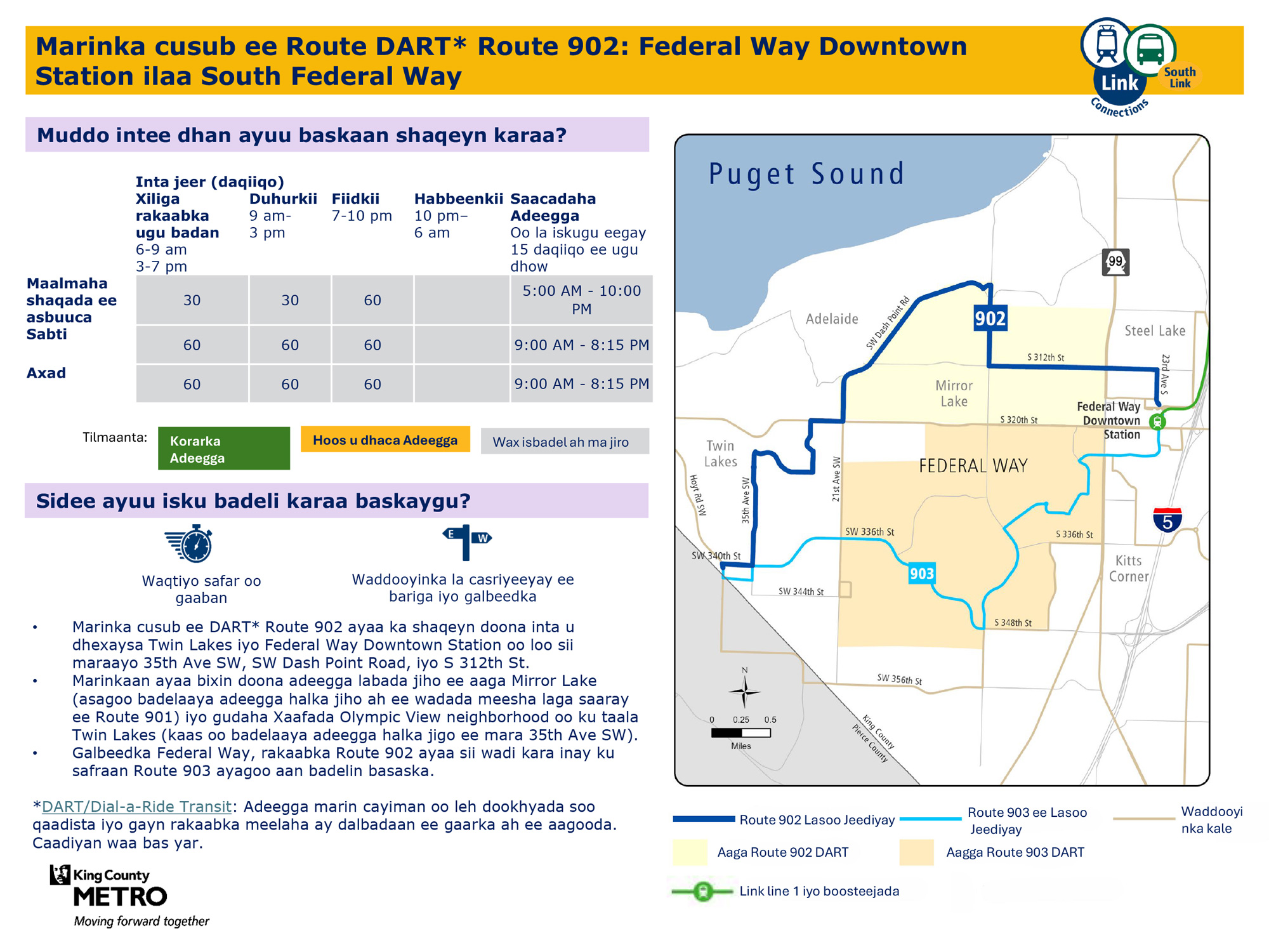 Waxaa lagu hormariyay safaro badan maalin kasta oo todobaadka ah. Waxay ku xiri doontaa tareenka fudud ee Link Federal Way Downtown Station. |