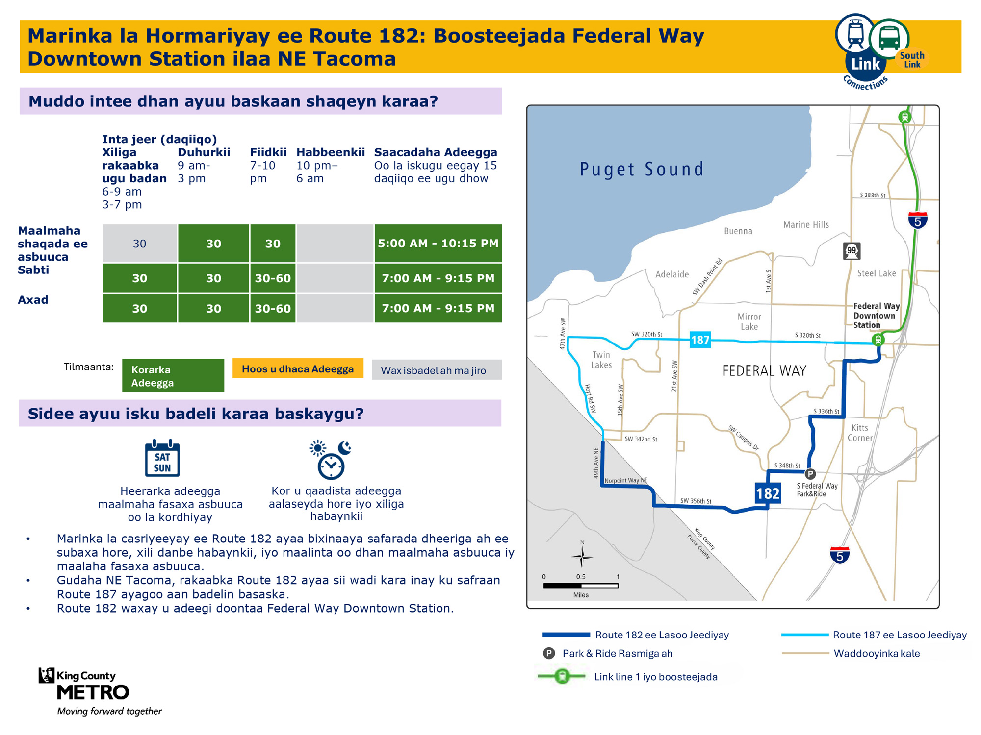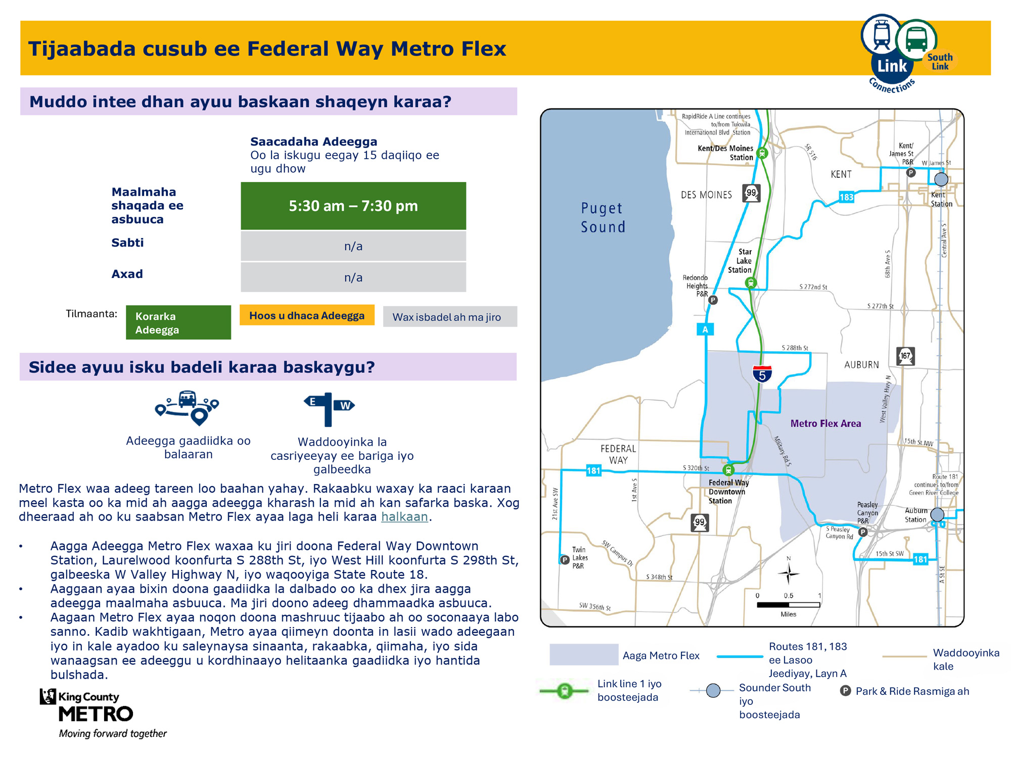 | Tijaabada Federal Way Metro Flex Waxay u adeegtaa Federal Way, Auburn | Goobta cusub ee Metro Flex ee tijaabada ah bixinta adeega la helo marka loo baahdo ee Isniinta ilaa Jimcaha. U adeega Federal Way Downtown Station, Laurelwood ee koonfurta S 288th St iyo West Hill ee koonfurta S 298th St, west of W Valley Highway N, iyo waqooyiga State Route 18. |