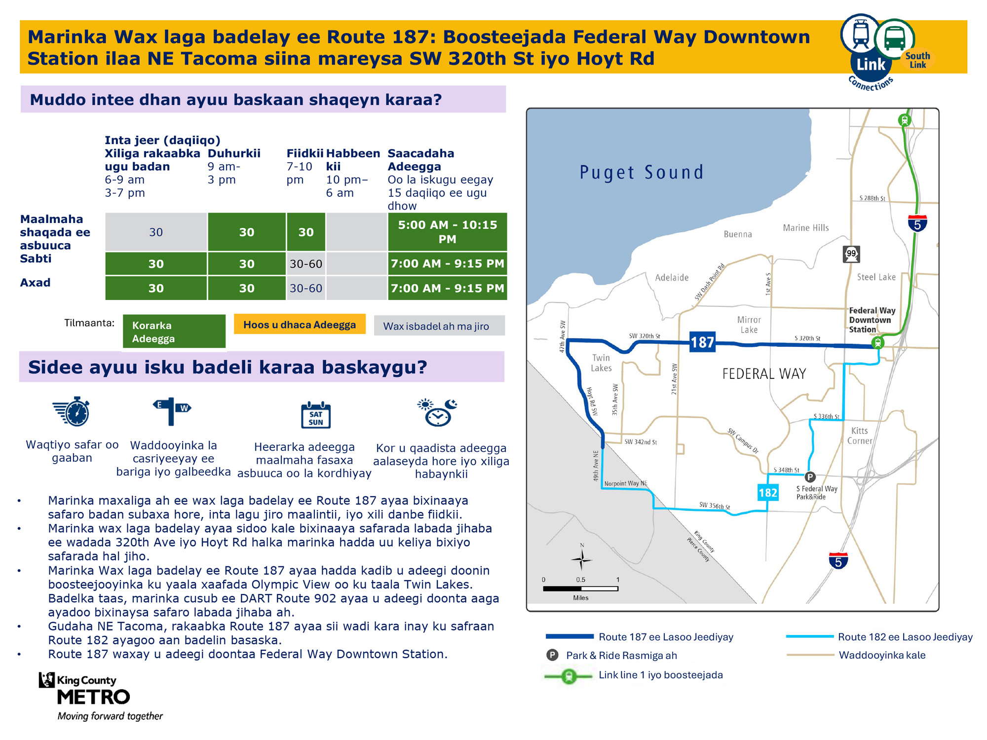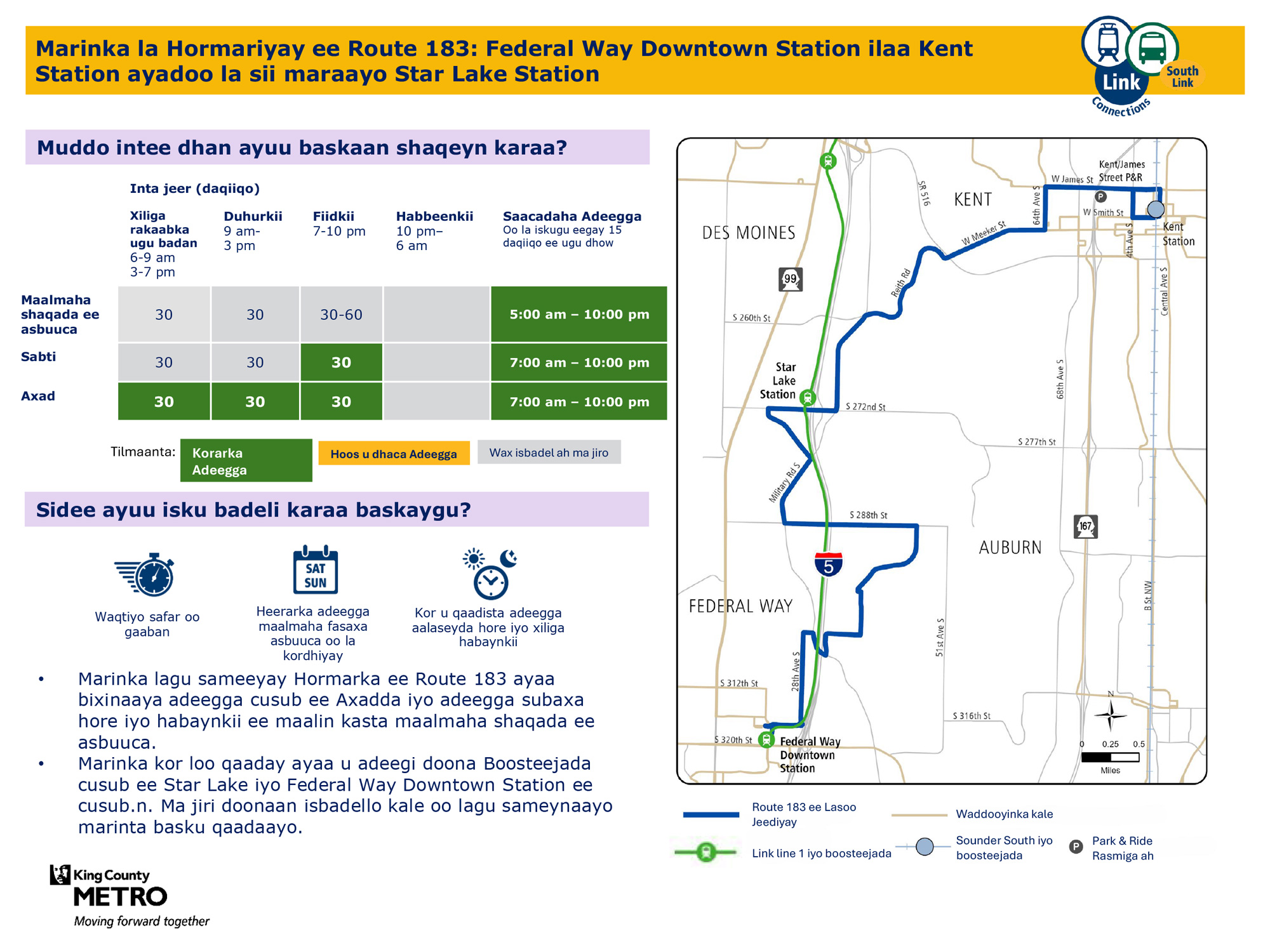 | Balaarinta Federal Way Link Waxay u adeegtaa Des Moines, Kent, Federal Way | Sadexda boostaajo ee tareenka fudud ee cusub: Kent Des Moines, Star Lake iyo Federal Way Downtown. |