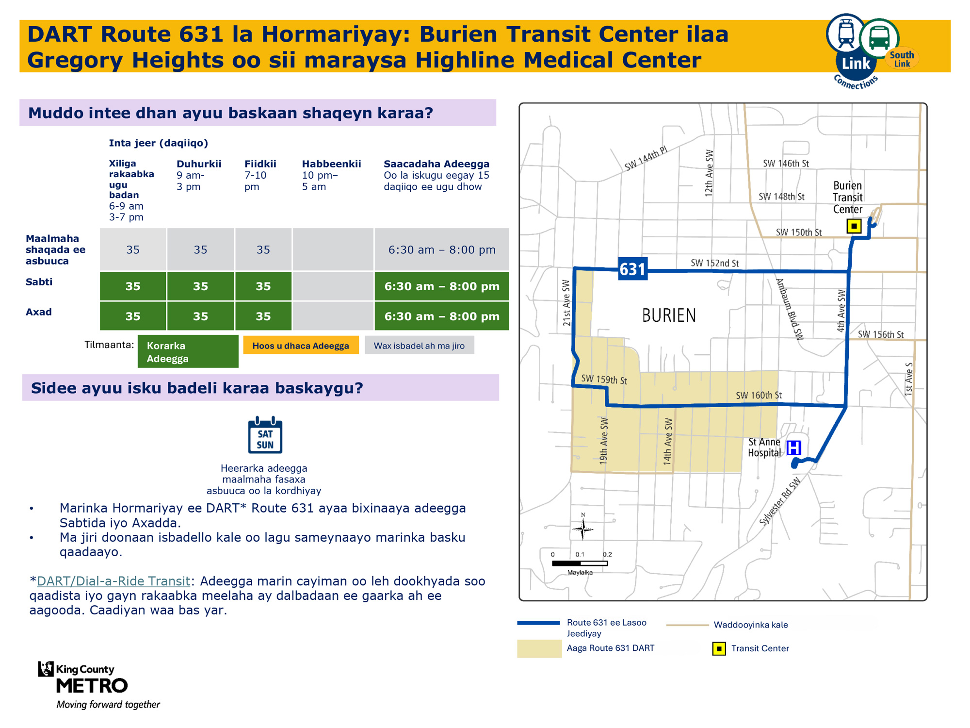 - Adeegga dhammaadka usbuuca oo la ballaariyay: Waxay soo bandhigaysaa adeeg cusub oo Sabtida iyo Axadda ah waxayna kordhinaysaa soo noqnoqoshada dhammaadka usbuuca ee waddooyinka waaweyn. Si gaar ah, waxaa jiri doona adeeg cusub oo dhammaadka usbuuca ah Burien, adeeg cusub oo Axad ah inta u dhaxaysa Kent iyo Federal Way, iyo adeegyo badan oo soo noqnoqda dhammaadka usbuuca inta u dhaxaysa Kent Des Moines Saldhigga, Kent Saldhigga, Kent East Hill iyo Green River College. Soo jeedinta shabakadda ee kama dambaysta ah waxay bixin doontaa 57% safarro dheeraad ah Sabtida iyo ku dhawaad laba jibaar safarro badan Axadda marka la barbar dhigo maanta.