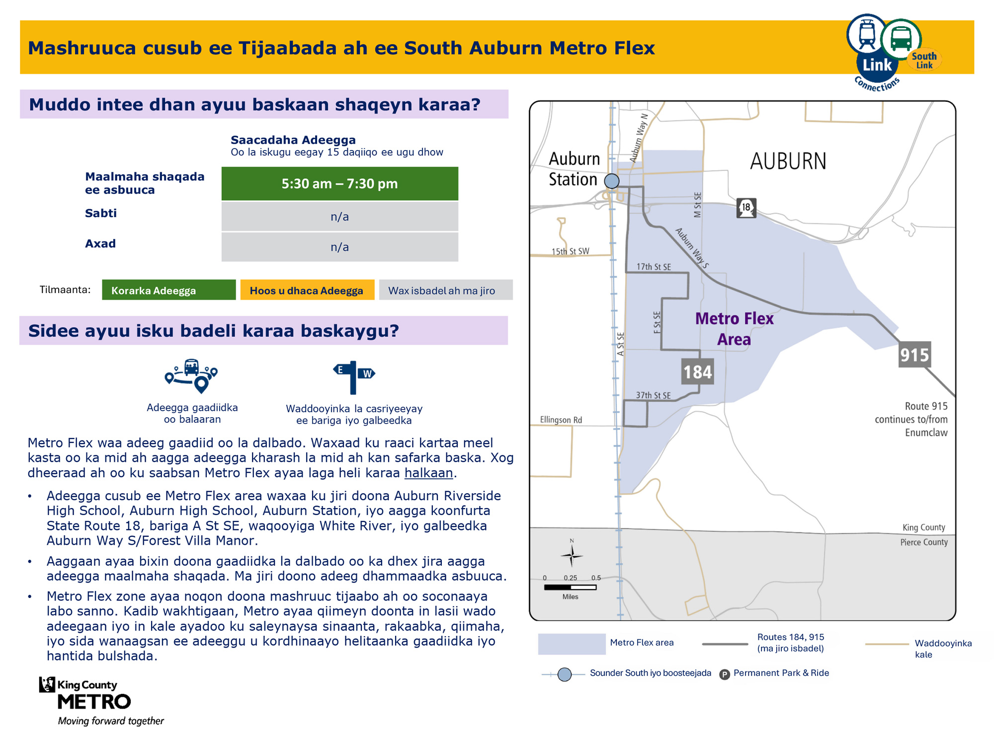 | Mashruuca Tijaabada ah ee South Auburn Metro Flex Waxay u adeegtaa Auburn | Goobta cusub ee Metro Flex ee tijaabada ah bixinta adeega la helo marka loo baahdo ee Isniinta ilaa Jimcaha. U adeega goobaha koonfureed ee State Route 18, ee bariga A Street SE, waqooyiga ee White River iyo galbeedka Auburn Way S/Forest Villa Manor. Waxaa kamid ah Auburn Station iyo Riverside High School. |