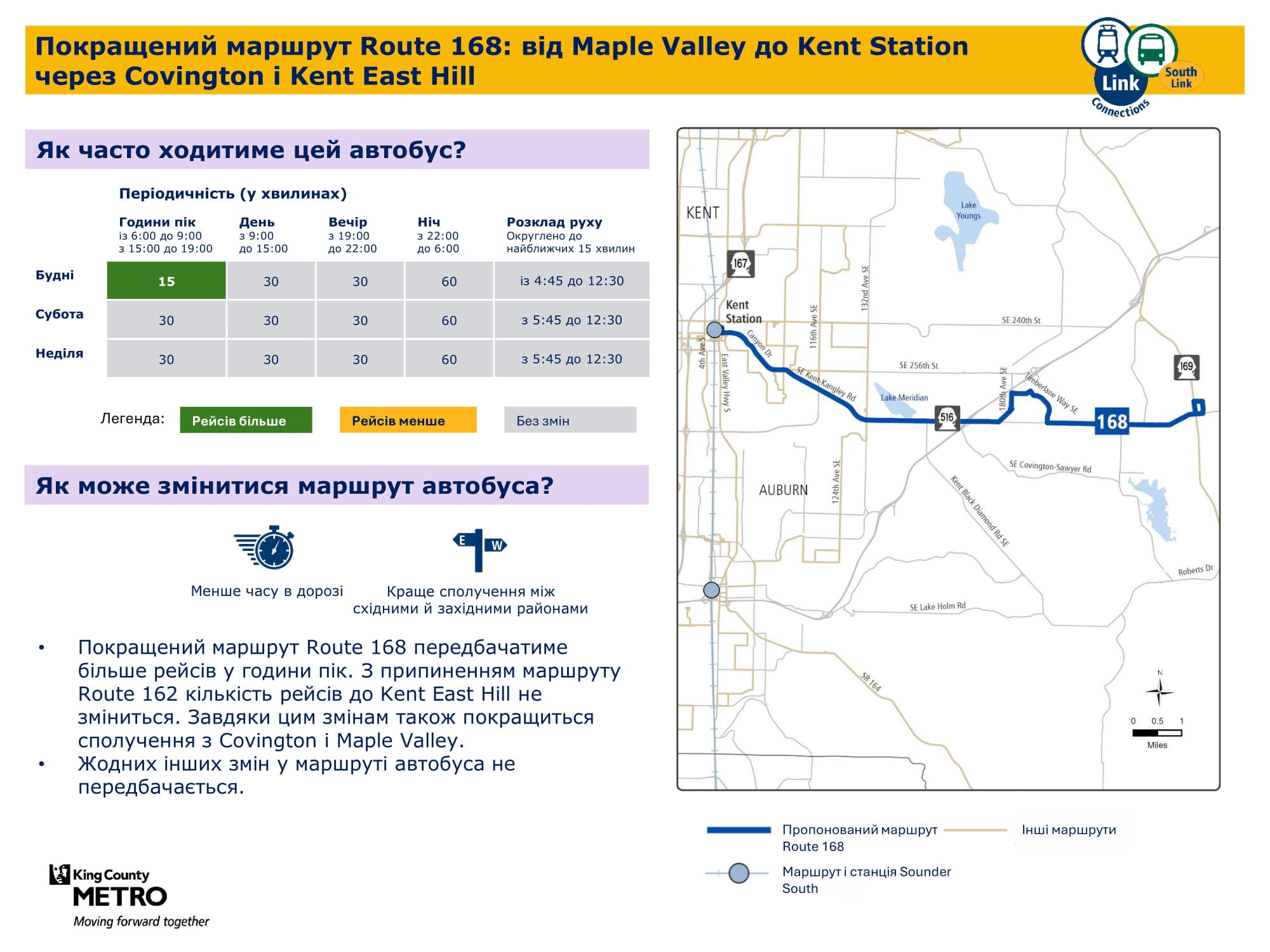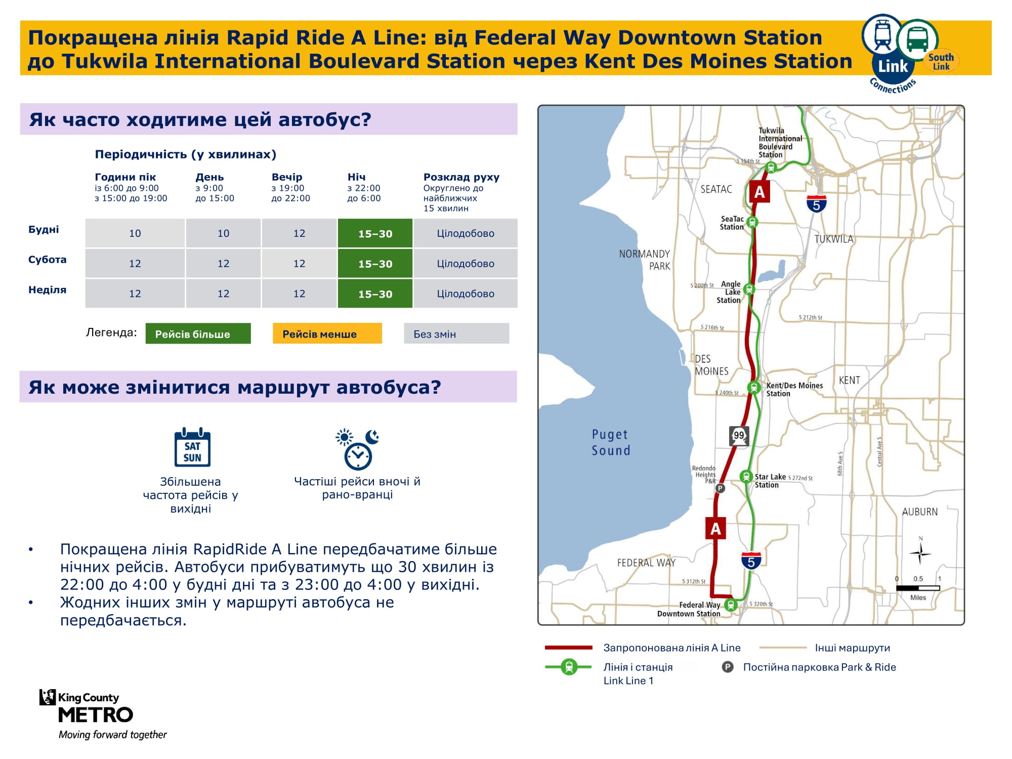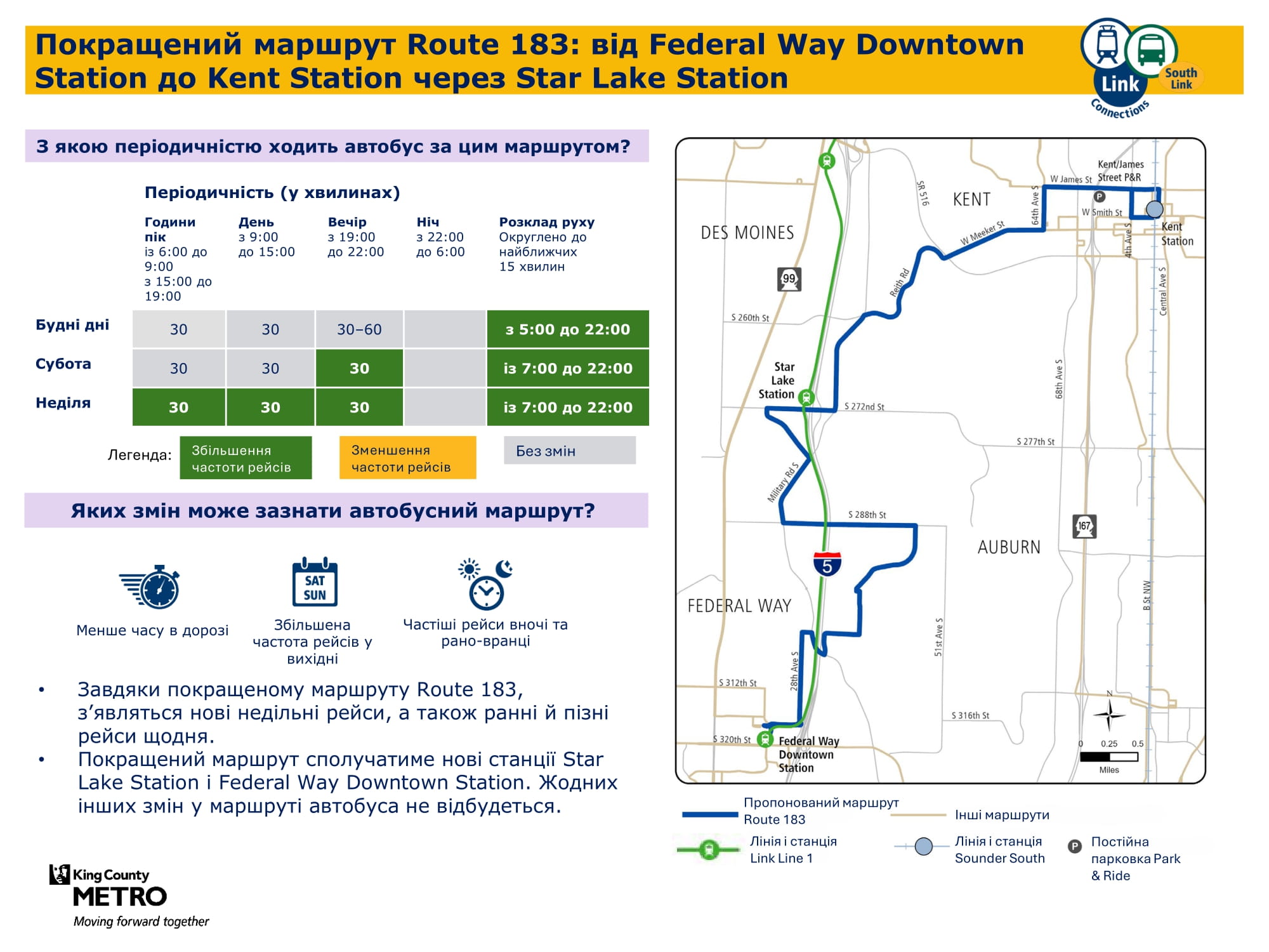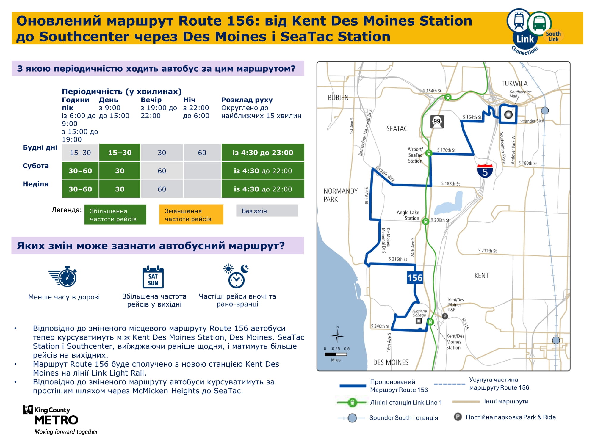 Більша кількість щоденних рейсів. Дасть змогу робити пересадку на станції Kent Des Moines легкорейкового трамвая Link і подорожувати більш прямим маршрутом через McMicken Heights. |