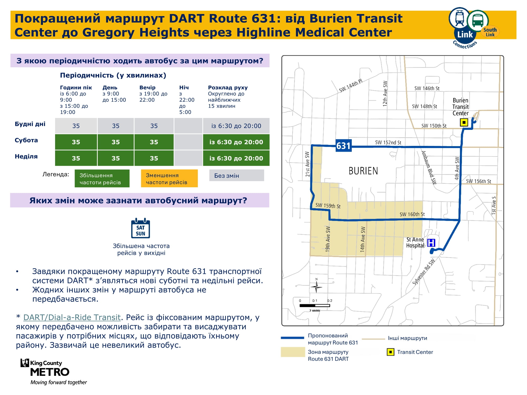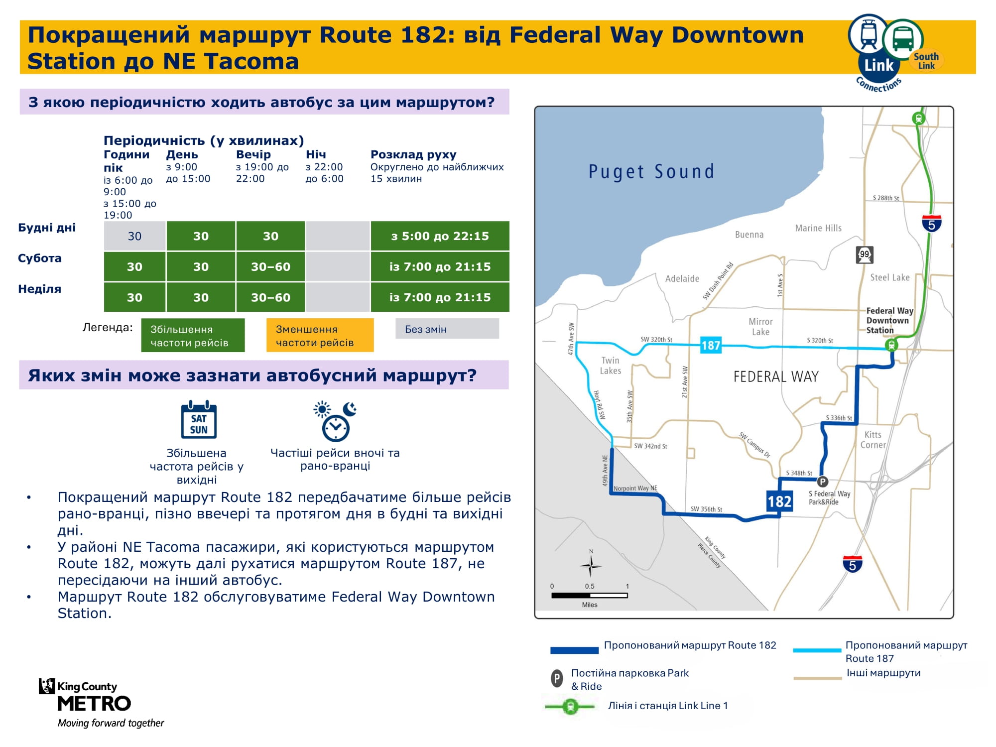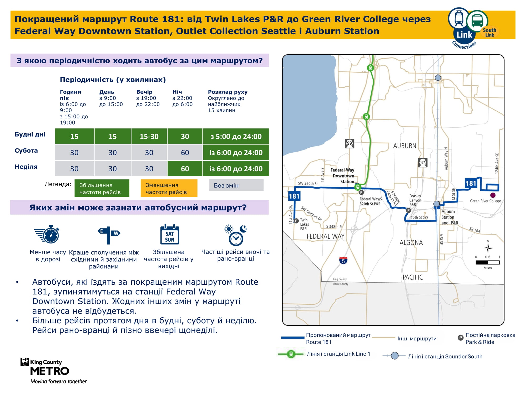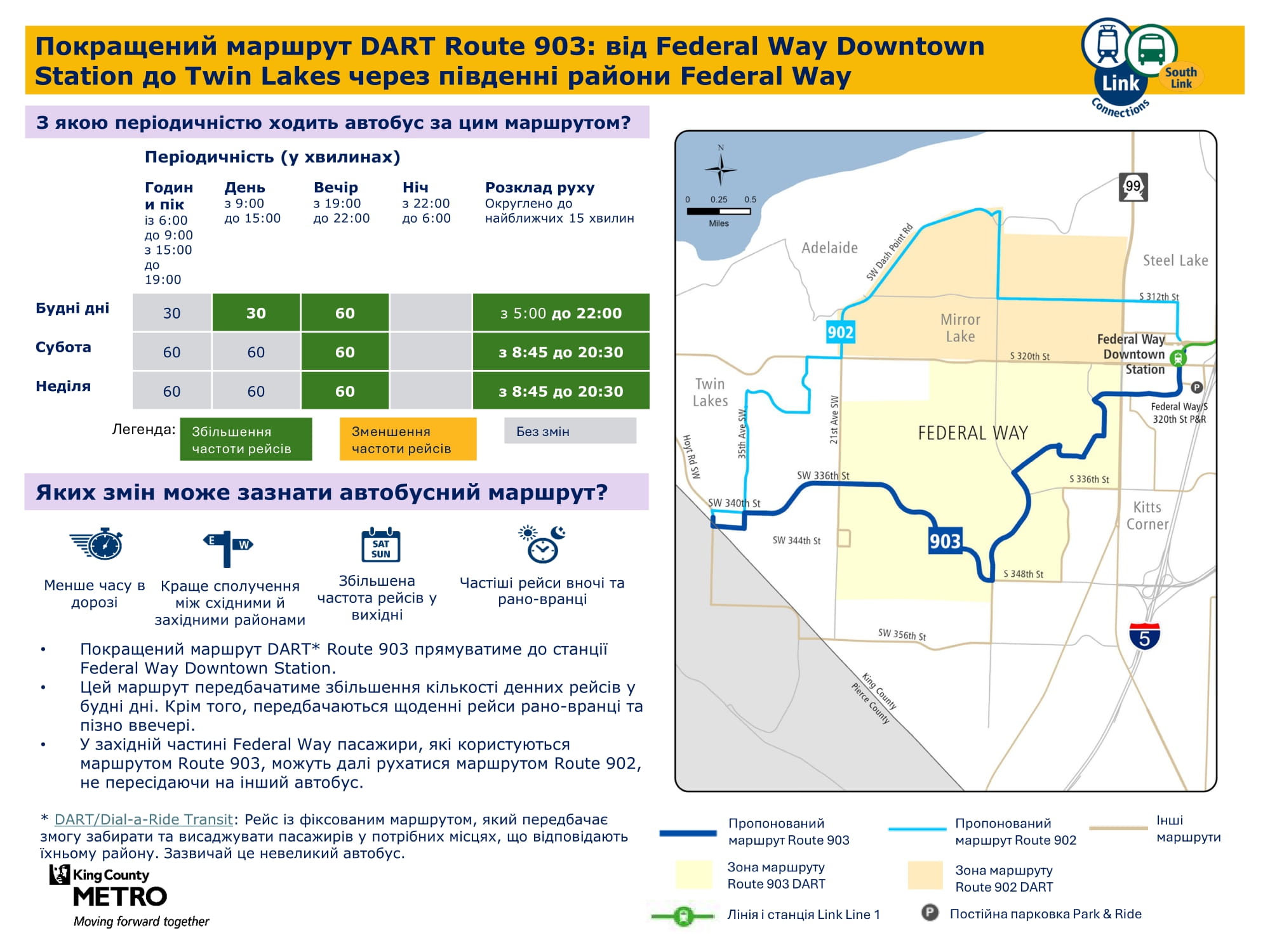 Більша кількість щоденних рейсів. Дасть змогу робити пересадку на станції Kent Des Moines легкорейкового трамвая Link і подорожувати більш прямим маршрутом через McMicken Heights. |
