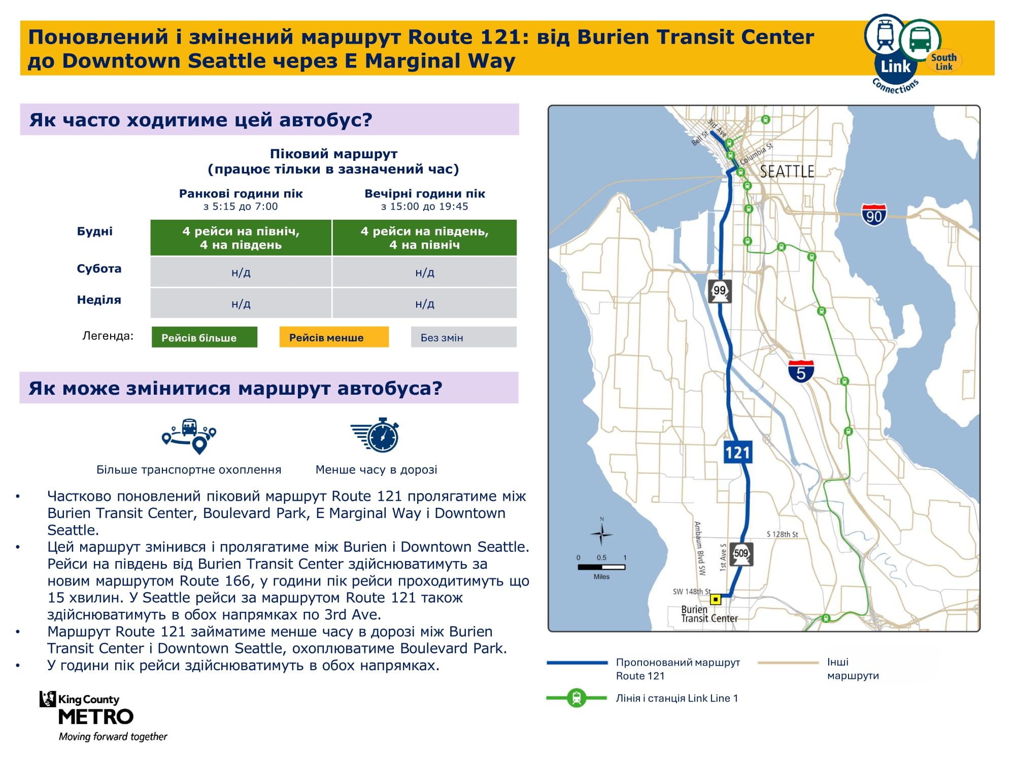 | 121 Обслуговування в місті Burien і центрі міста Seattle. |