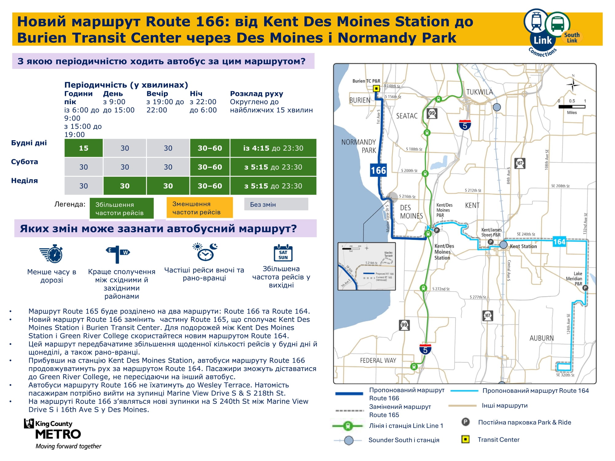 Новий маршрут із високою частотою курсування в пікові години й більшою кількістю щоденних рейсів. Частково замінює маршрут 165. Маршрут забезпечує можливість пересадки на легкорейковий транспорт Link на станції Kent Des Moines. Усі рейси стануть частиною маршруту 164 для пасажирів, які прямують далі, ніж станція Kent Des Moines. Подивіться, як працюватимуть маршрути 164 і 166 |