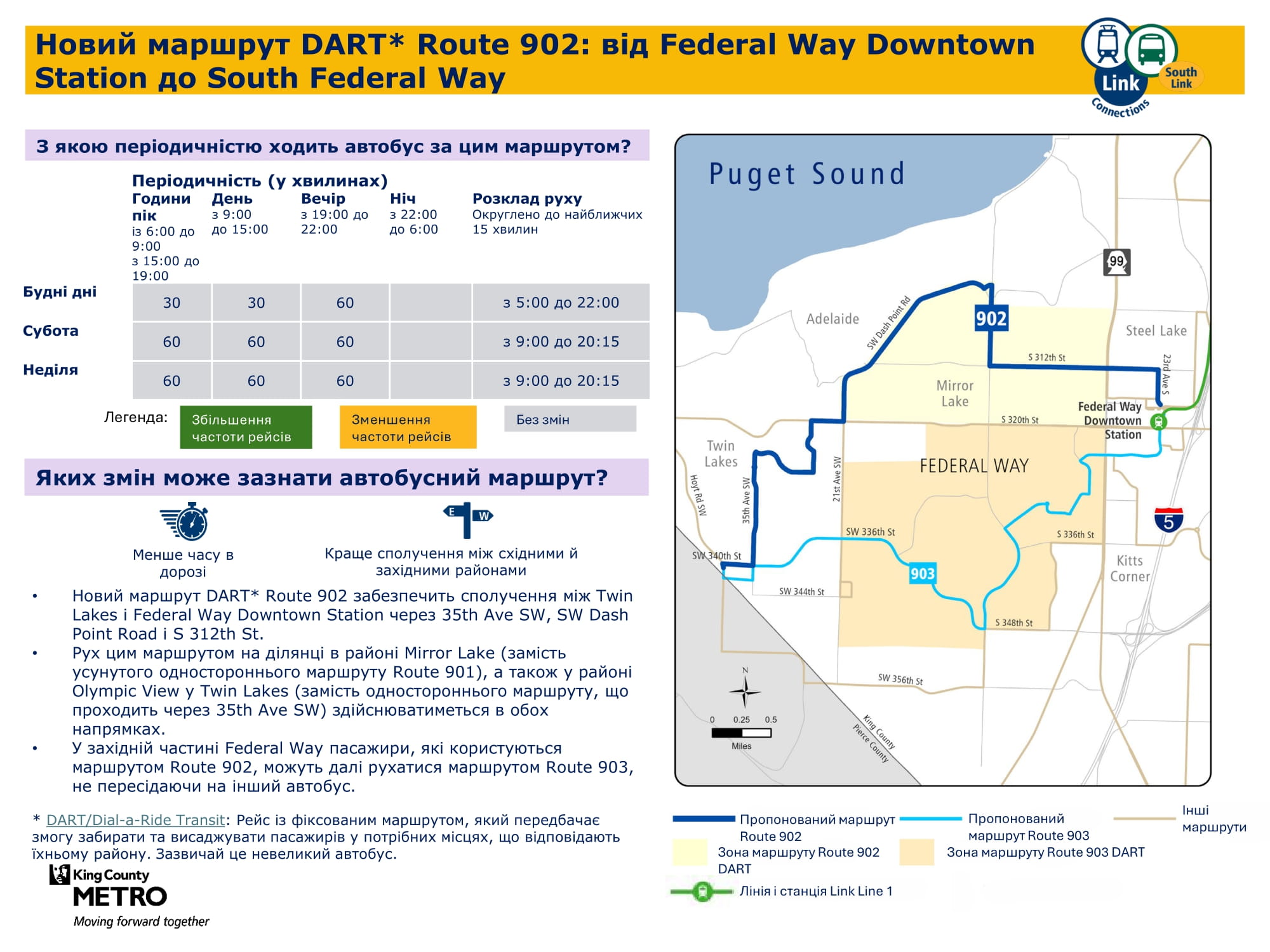Новий маршрут DART. Частково замінює маршрут DART 901. Буде збільшено кількість рейсів у будні та вихідні. Дасть змогу робити пересадку на легкорейковий трамвай Link на станції Federal Way Downtown. |