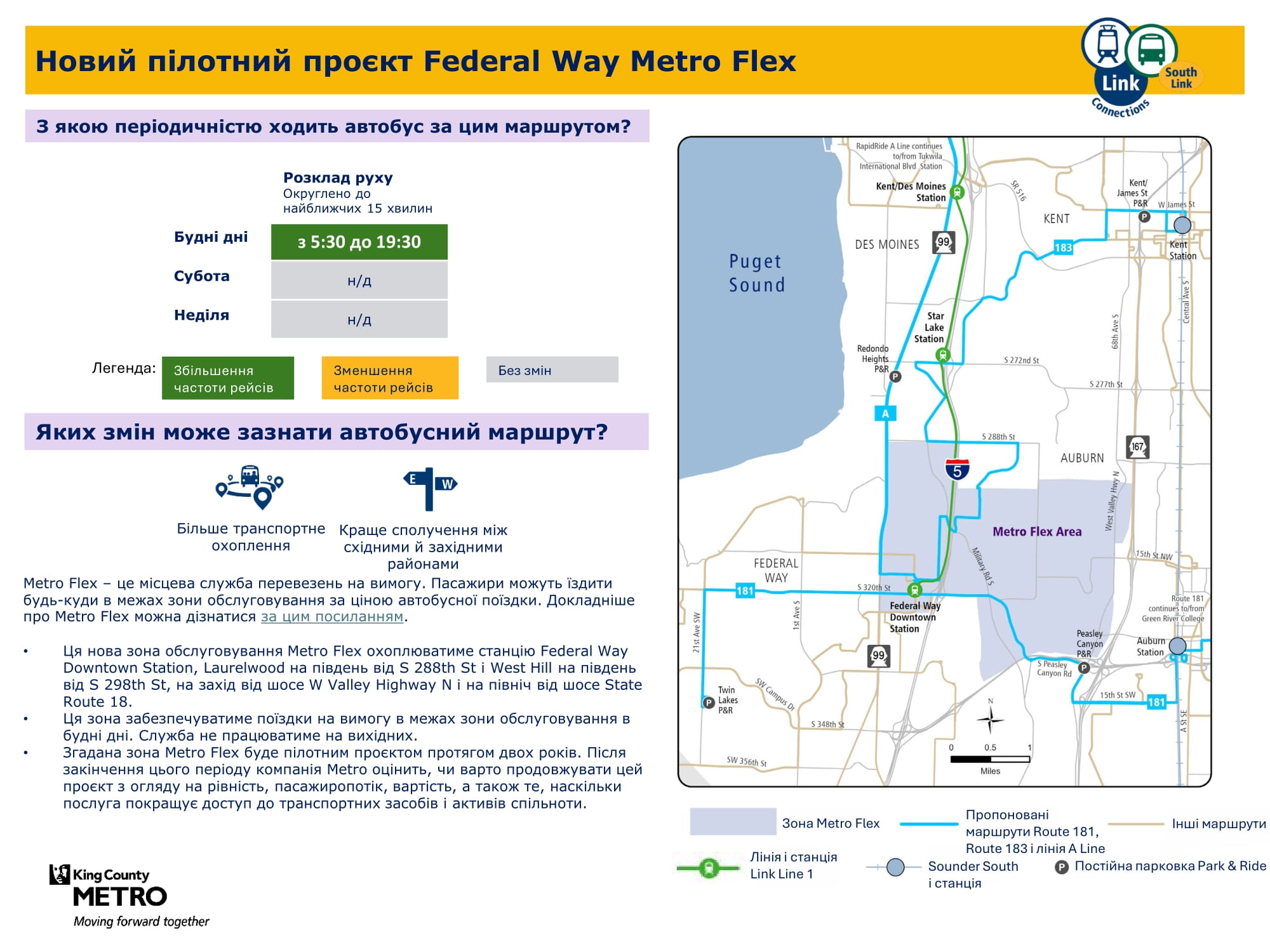| Пілотний проєкт Federal Way Metro Flex Обслуговує Federal Way, Auburn | Нова тестова зона Metro Flex, що пропонує транспорт на вимогу з понеділка до п’ятниці. Ця зона включає станцію Federal Way Downtown, територію Laurelwood на південь від S 288th St і West Hill на південь від S 298th St, на захід від W Valley Highway N і на північ від автомагістралі State Route 18. |