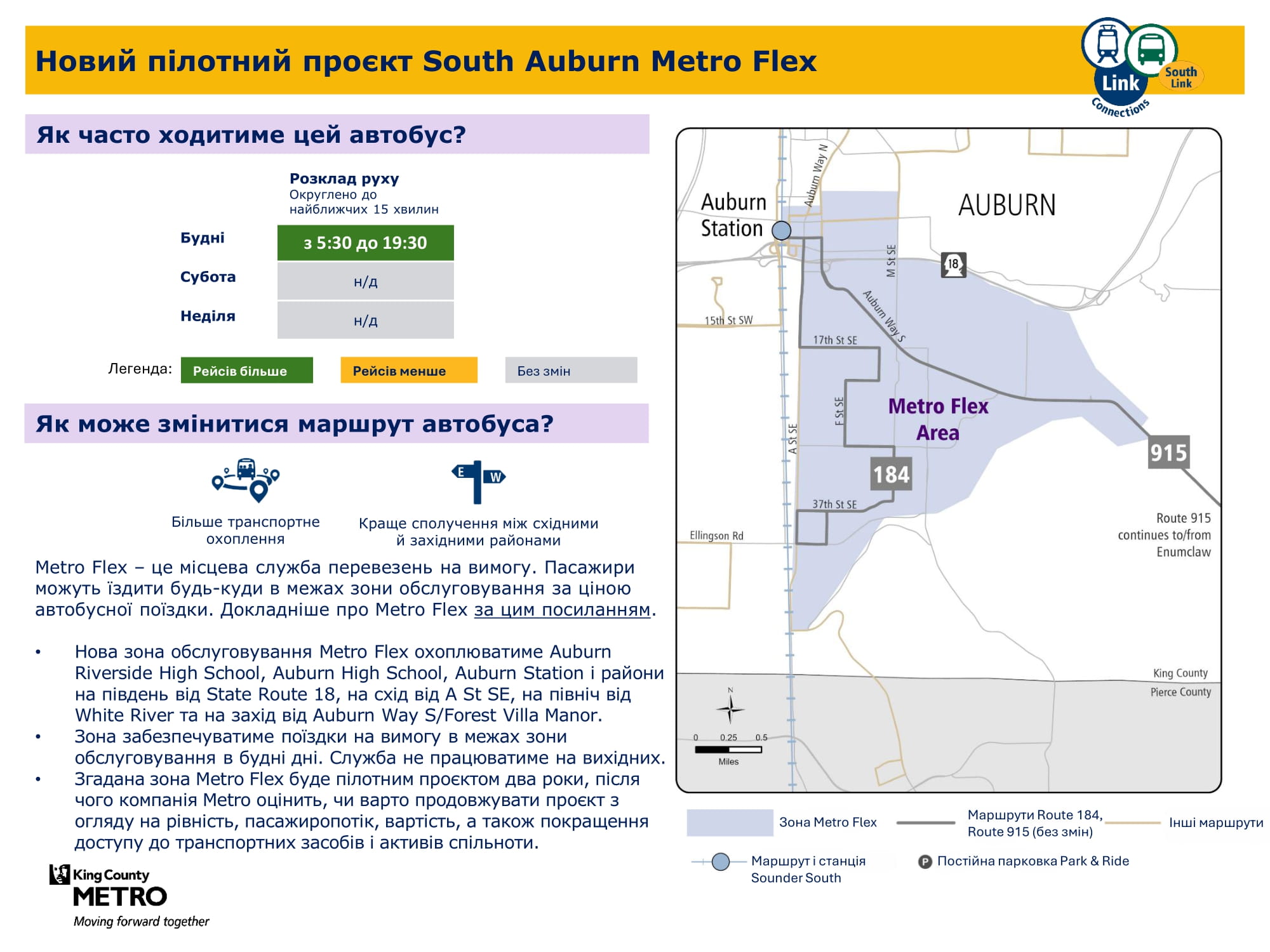 | Пілотний проєкт South Auburn Metro Flex Обслуговує Auburn | Нова тестова зона Metro Flex, що пропонує транспорт на вимогу з понеділка до п’ятниці. Зона обслуговування охоплює райони на південь від автомагістралі State Route 18, на схід від A Street SE, на північ від White River і на захід від Auburn Way S/Forest Villa Manor. Ця зона включає станцію Auburn та школу Riverside High School. |