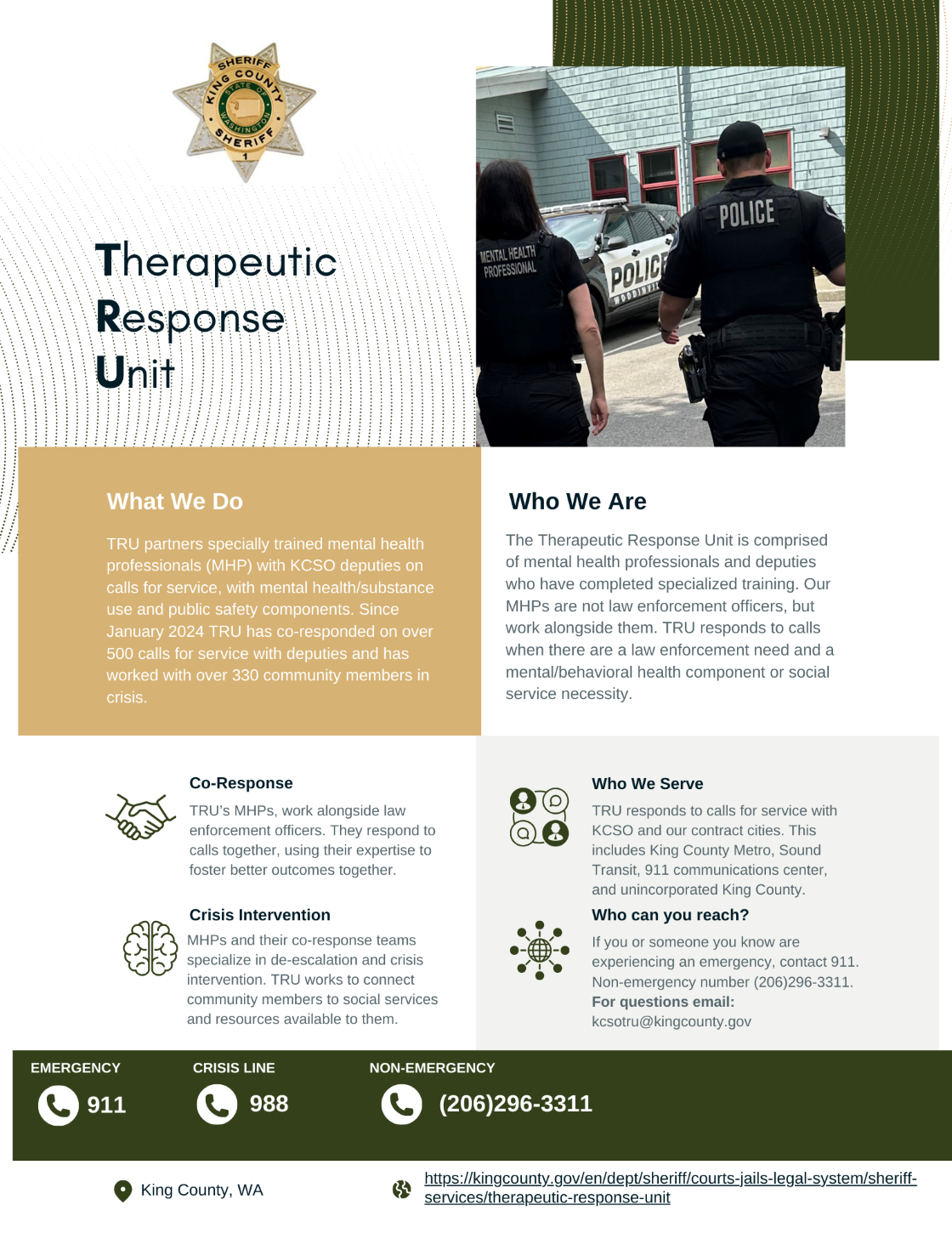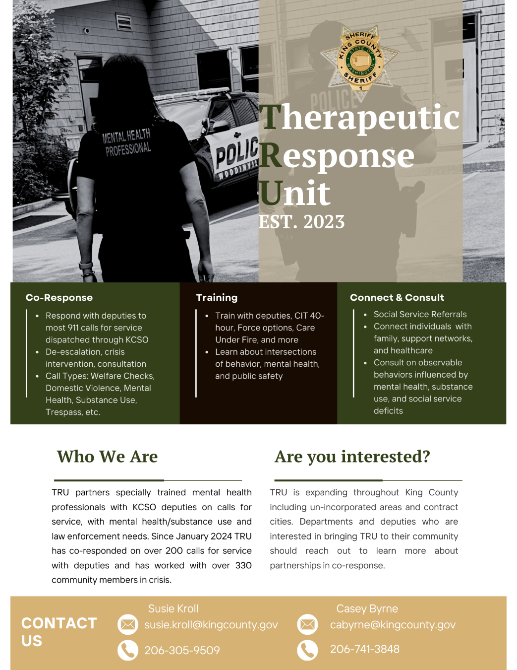 The King County Sheriff’s Office (KCSO) has initiated the development of a Therapeutic Response Unit (TRU) to enhance crisis response capabilities of the KCSO across our service area. TRU is a progressive approach to law enforcement public safety which integrates mental health professionals with specially trained KCSO deputies to form co-responder teams with responsibilities that include de-escalation, crisis intervention, service referrals, and support for treatment processes.